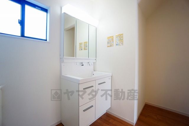 三面鏡つき洗面台。収納も一体型になっているので、ドライヤーやヘアアイロンの置き場に困りませんね。