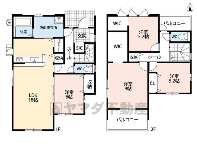 LDK18畳(1F)、洋6畳(1F)、洋9畳(2F)、洋5.2畳(2F) |