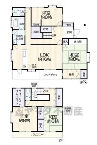 LDK16畳(1F)、和8畳(1F)、洋8畳(1F)、洋8畳(2F)、和6畳(2F) |