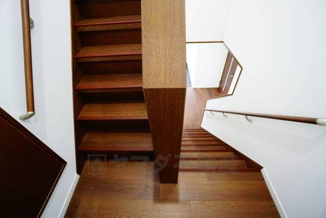 ご年配の方でも安心できる、手すり付き階段です^^段差も低めで設定されてますので安全性にも優れてますね^^