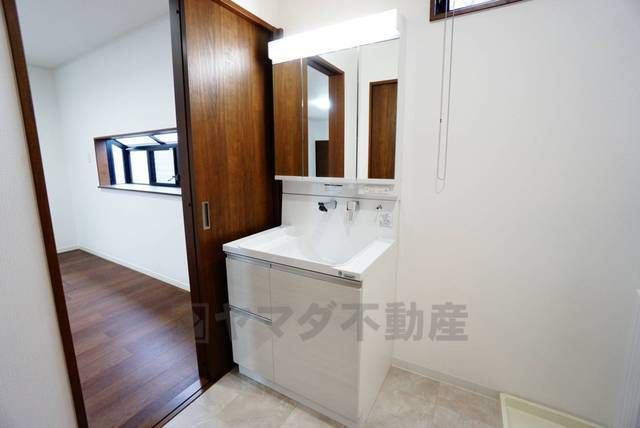 三面鏡つき洗面台。収納も一体型になっているので、ドライヤーやヘアアイロンの置き場に困りませんね。