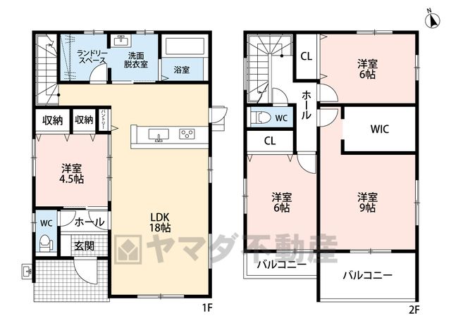 LDK18畳(1F)、洋4.5畳(1F)、洋9畳(2F)、洋6畳(2F) |