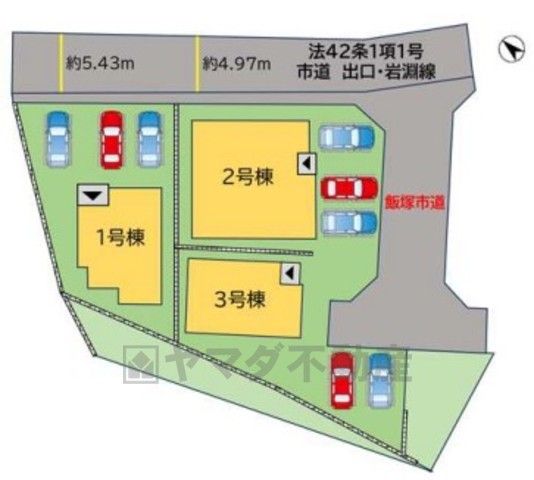 2号棟。前面道路は公道北東側約4.97m。車通りも少なく、安全性も確保。カースペースは並列2~3台分を確保^^