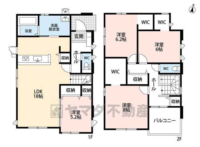 LDK18畳(1F)、洋5.2畳(1F)、洋8畳(2F)、洋6.2畳(2F)、洋6畳(2F) |