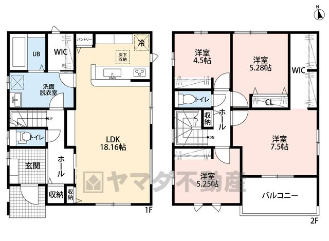 LDK18.1畳(1F)、洋7.5畳(2F)、洋5.2畳(2F)、洋5.2畳(2F)、洋4.5畳(2F) |
