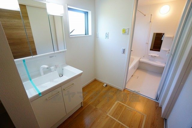 同仕様写真。三面鏡つき洗面台。収納も一体型になっているので、ドライヤーやヘアアイロンの置き場に困りませんね。