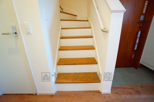 ご年配の方でも安心できる、手すり付き階段です^^段差も低めで設定されてますので安全性にも優れてますね^^