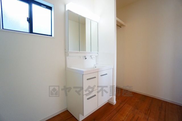 三面鏡つき洗面台。収納も一体型になっているので、ドライヤーやヘアアイロンの置き場に困りませんね。