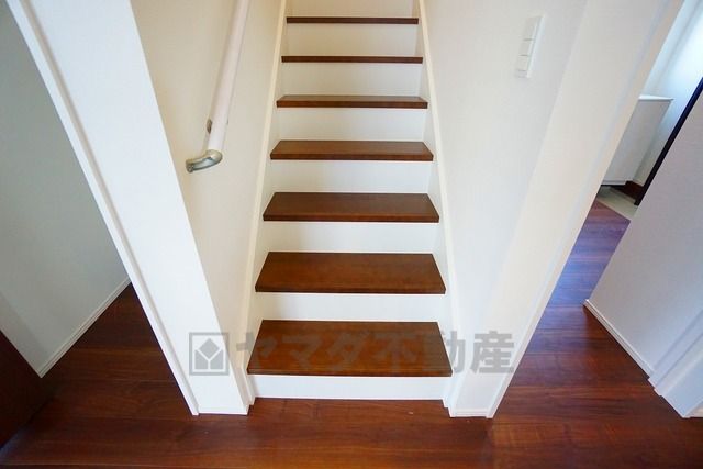 ご年配の方でも安心できる、手すり付き階段です^^段差も低めで設定されてますので安全性にも優れてますね^^
