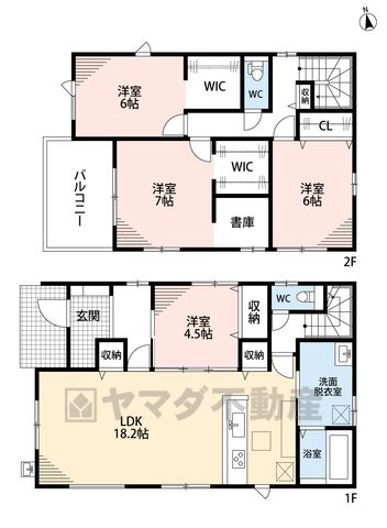 LDK18.2畳(1F)、洋4.5畳(1F)、洋7畳(2F)、洋6畳(2F)、その他0畳 |
