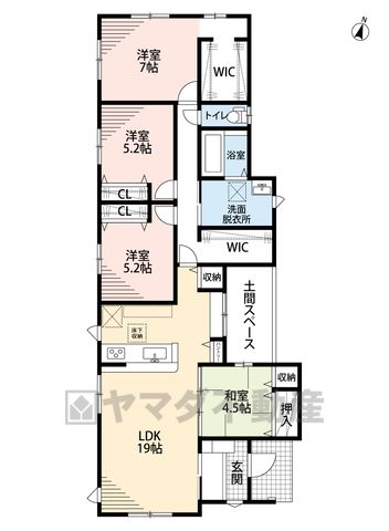 LDK19畳(1F)、和4.5畳(1F)、洋5.2畳(1F)、洋7畳(1F) |