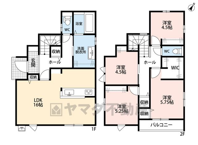 LDK16畳(1F)、洋5.7畳(2F)、洋4.5畳(2F)、洋5.2畳(2F) |