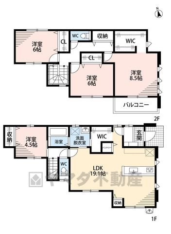 LDK19.1畳(1F)、洋4.5畳(1F)、洋8.5畳(2F)、洋6畳(2F) |