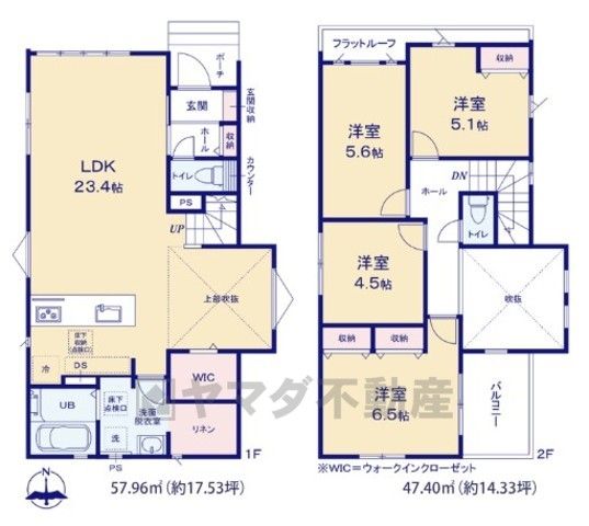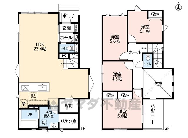 LDK23.4畳(1F)、洋6.5畳(2F)、洋5.6畳(2F)、洋5.1畳(2F)、洋4.5畳(2F) |