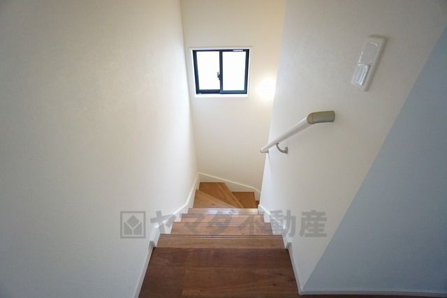 ご年配の方でも安心できる、手すり付き階段です^^段差も低めで設定されてますので安全性にも優れてますね^^