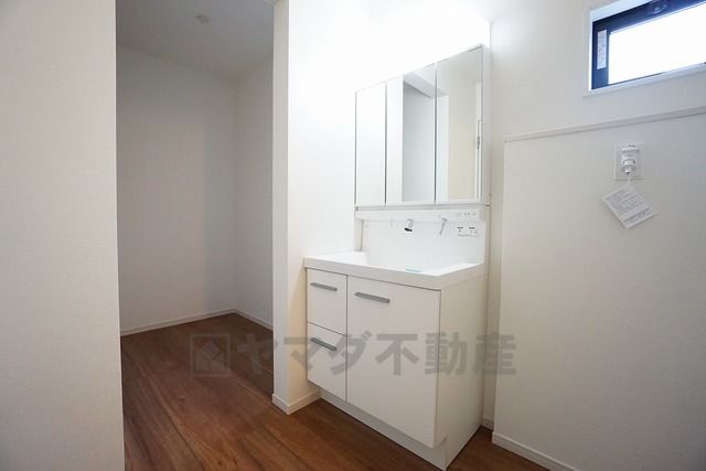 三面鏡つき洗面台。収納も一体型になっているので、ドライヤーやヘアアイロンの置き場に困りませんね。