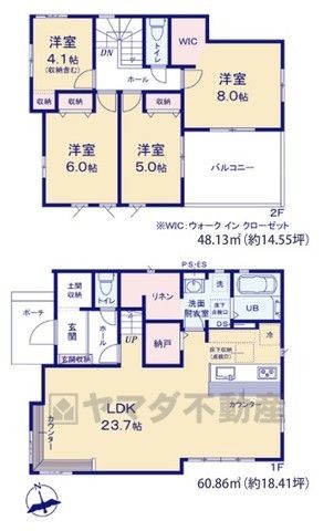 LDK23.7畳(1F)、洋8畳(2F)、洋6畳(2F)、洋5畳(2F)、洋4.1畳(2F) |