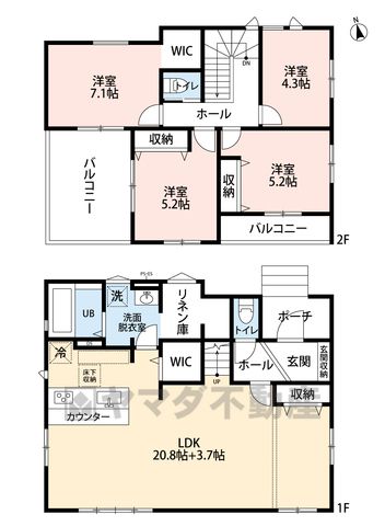 LDK24.5畳(1F)、洋7.1畳(2F)、洋5.2畳(2F)、洋4.3畳(2F) |