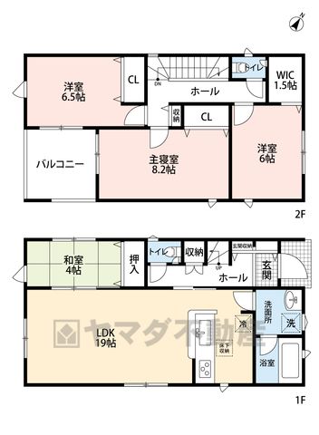 LDK19畳(1F)、和4畳(1F)、洋8.2畳(2F)、洋6.5畳(2F)、洋5畳(2F) |