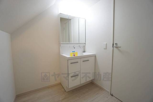三面鏡つき洗面台。収納も一体型になっているので、ドライヤーやヘアアイロンの置き場に困りませんね。