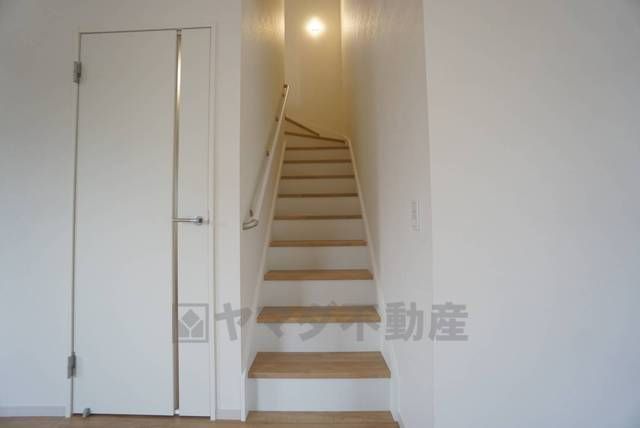 ご年配の方でも安心できる、手すり付き階段です^^段差も低めで設定されてますので安全性にも優れてますね^^