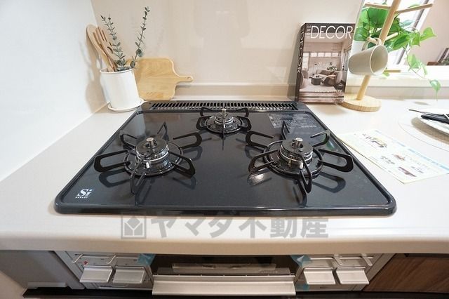 3種類の料理が同時に調理できる、3口ガスコンロ。忙しい夕食の支度時間が短縮できて嬉しいですね。