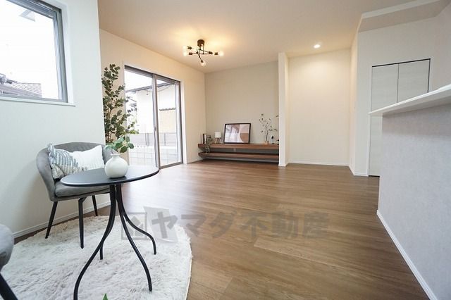 大きな窓のあるリビングは、陽光あふれる明るい空間です。居心地良く、ご家族皆がゆったりくつろげる憩いの空間となりそうです。