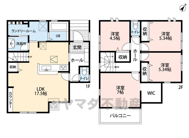 LDK17.5畳(1F)、洋7畳(2F)、洋5.3畳(2F)、洋4.5畳(2F) |