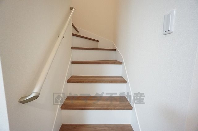 ご年配の方でも安心できる、手すり付き階段です^^段差も低めで設定されてますので安全性にも優れてますね^^