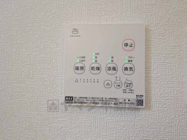 雨の日の洗濯も安心できる浴室暖房乾燥機付き浴室。リモコンで操作もボタン1つで簡単。 浴室暖房乾燥機には、暖房、乾燥、涼風、換気の4つの機能が付いています。タイマー付きです。