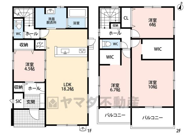 LDK18.2畳(1F)、洋4.5畳(1F)、洋10畳(2F)、洋6.7畳(2F)、洋6畳(2F) |