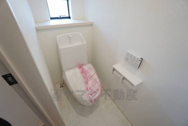 温水洗浄機付トイレです。節水機能もあるので、安心して使えますね。もちろん、1階2階の2ヶ所にトイレがあるので、忙しい朝にもゆとりができますね。