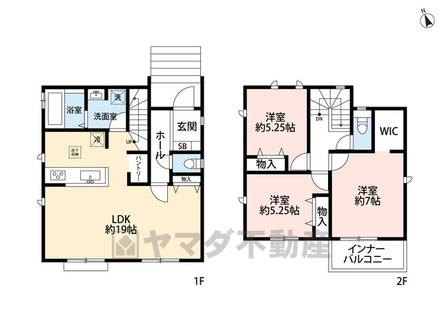 LDK19畳(1F)、洋7畳(2F)、洋5.2畳(2F) |