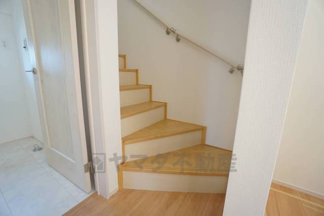 ご年配の方でも安心できる、手すり付き階段です^^段差も低めで設定されてますので安全性にも優れてますね^^