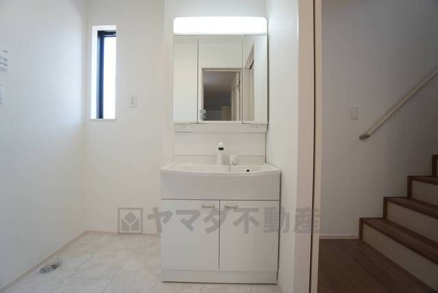 三面鏡つき洗面台。収納も一体型になっているので、ドライヤーやヘアアイロンの置き場に困りませんね。