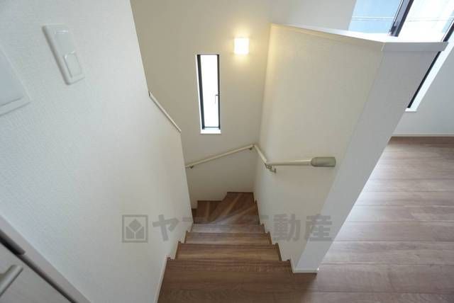 ご年配の方でも安心できる、手すり付き階段です^^段差も低めで設定されてますので安全性にも優れてますね^^