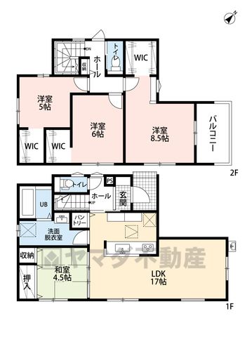 LDK17畳(1F)、和4.5畳(1F)、洋8.5畳(2F)、洋6畳(2F)、洋5畳(2F) |