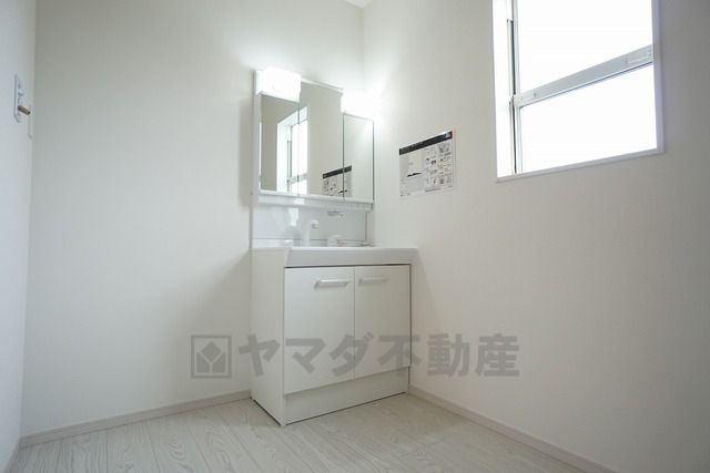 同仕様写真。三面鏡裏収納付き洗面化粧台です^^ 歯磨きセットやスキンケア用品などの収納に便利ですね。 生活感も隠すことができ、来客時にも安心です。