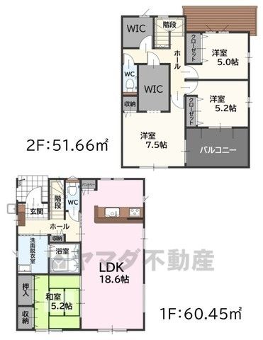 LDK18.6畳(1F)、和5.2畳(1F)、洋5畳(2F)、洋5.2畳(2F)、洋7.5畳(2F) |