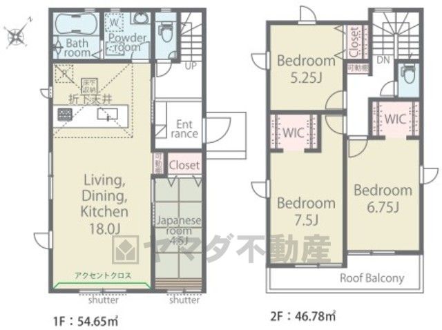 LDK18畳(1F)、和4.5畳(1F)、洋7.5畳(2F)、洋6.7畳(2F)、洋5.2畳(2F) |