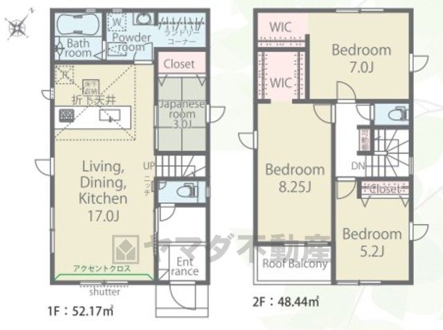 LDK18畳(1F)、和4.5畳(1F)、洋7.5畳(2F)、洋6.7畳(2F)、洋5.2畳(2F) |