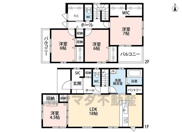 LDK18畳(1F)、洋4.5畳(1F)、洋7畳(2F)、洋6畳(2F) |