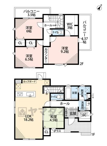 LDK18.2畳(1F)、和4.5畳(1F)、洋6畳(2F)、洋6.5畳(2F)、洋9.2畳(2F) |