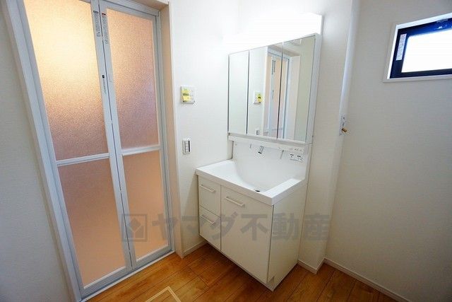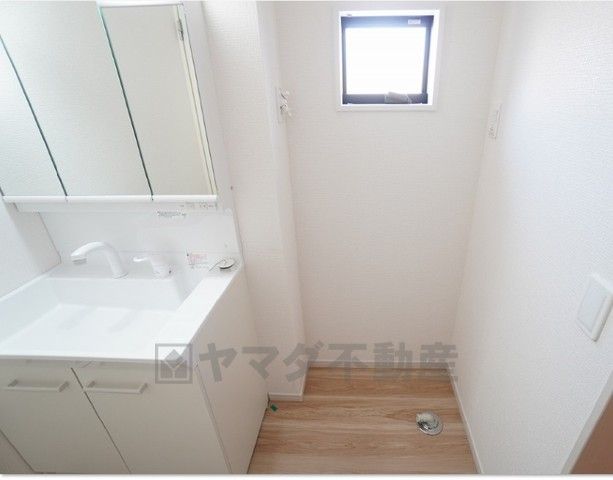 同仕様写真。三面鏡裏収納付き洗面化粧台です^^ 歯磨きセットやスキンケア用品などの収納に便利ですね。 生活感も隠すことができ、来客時にも安心です。