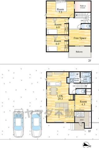 LDK20.3畳(1F)、洋4.5畳(1F)、洋7.5畳(2F)、洋6畳(2F) |