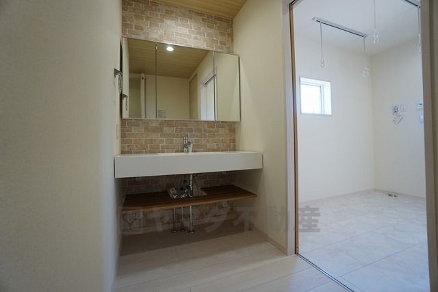 同仕様写真。三面鏡つき洗面台。収納も一体型になっているので、ドライヤーやヘアアイロンの置き場に困りませんね。