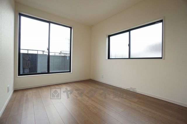 同仕様写真。明るい洋室です。ナチュラル色のフローリングで開放的な優しい雰囲気になっています^^ベッドや机、TVを置いてもゆとりのある広さです。