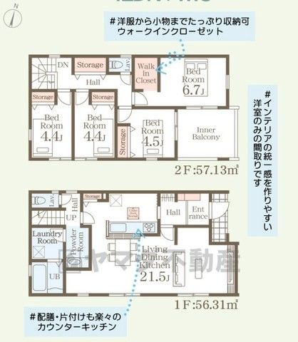LDK21.5畳(1F)、洋6.7畳(2F)、洋4.5畳(2F)、洋4.4畳(2F) |