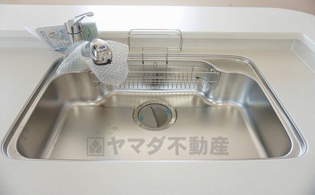 同仕様写真。広々とした凸型シンクに洗剤ポケットを標準装備。大きなお鍋など洗いやすいです。洗剤や石鹸、スポンジもすっきりできる収納付き。