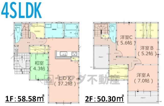 LDK17.2畳(1F)、和4.3畳(1F)、洋7畳(2F)、洋5.6畳(2F)、洋5.2畳(2F) |